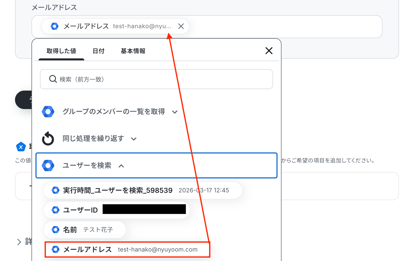 ステップ6:Google Workspaceでユーザーを検索 続いて、前のステップで取得した値を利用して、Google Workspaceでユーザーを検索しましょう。