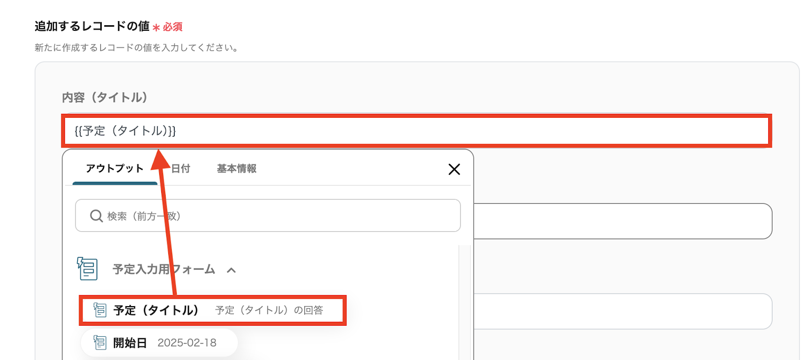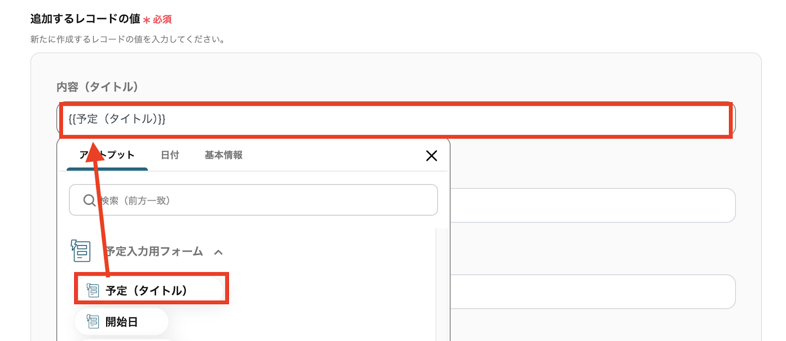 「追加するレコードの値」もアウトプットから選択していきましょう!