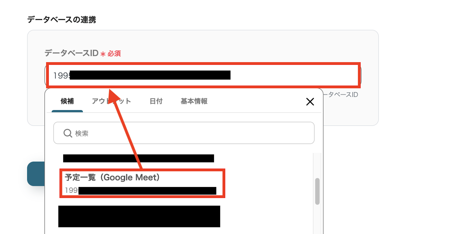最後に、Notionと連携をします。 Notionアプリと連携するアカウント情報が正しいか確認した上で、「データベースID」を入力していきます。