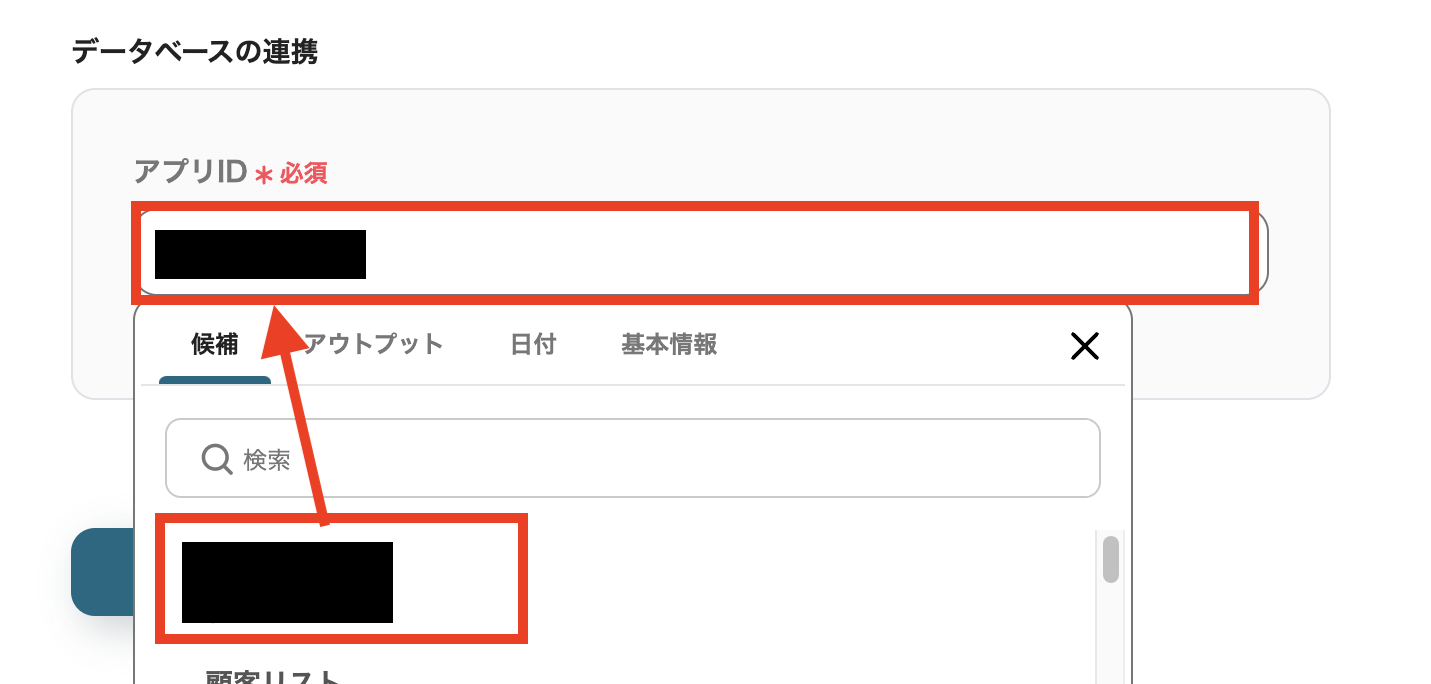 kintoneと連携するアカウント情報を確認したら、次に「アプリID」を入力します。 候補から選びましょう。
