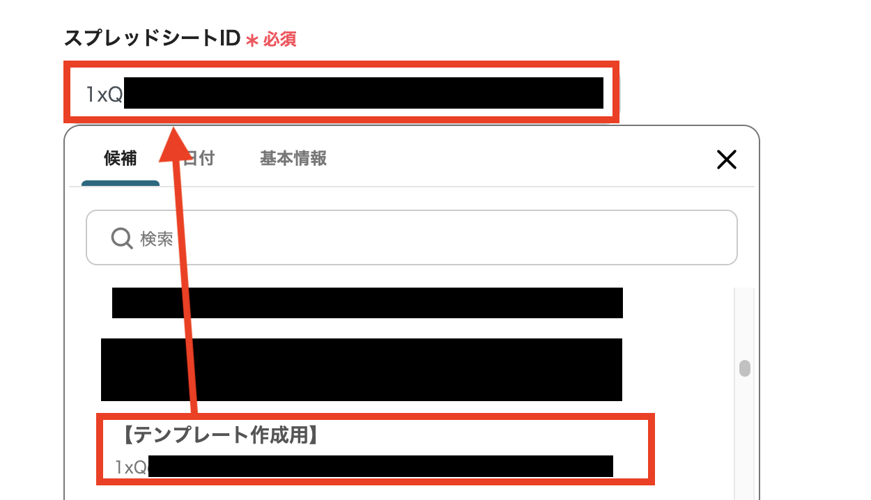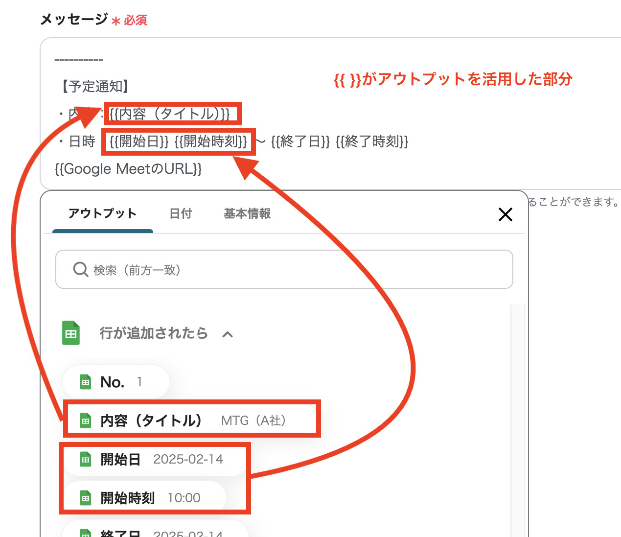 「スプレッドシートID」や「シートID」はアウトプットから選択すると簡単に入力することができますよ!