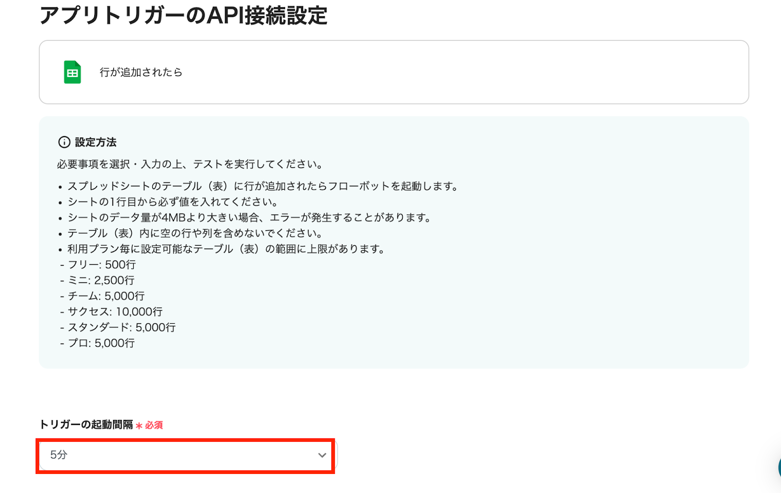 次に、Google スプレッドシート内のどこのシートに行が追加された時にフローボットを起動するのか選択します。