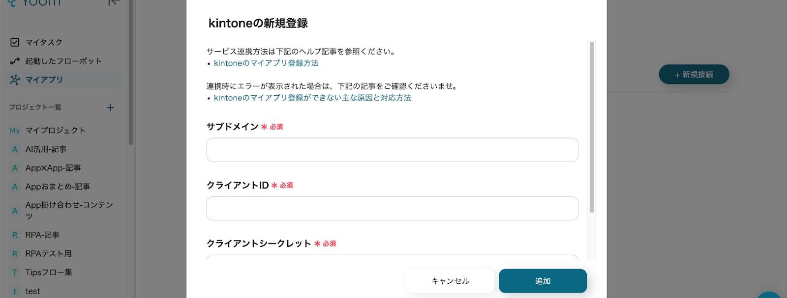 kintoneのアプリをクリックすると、「サブドメイン」「クライアントID」「クライアントシークレット」の入力が求められます。