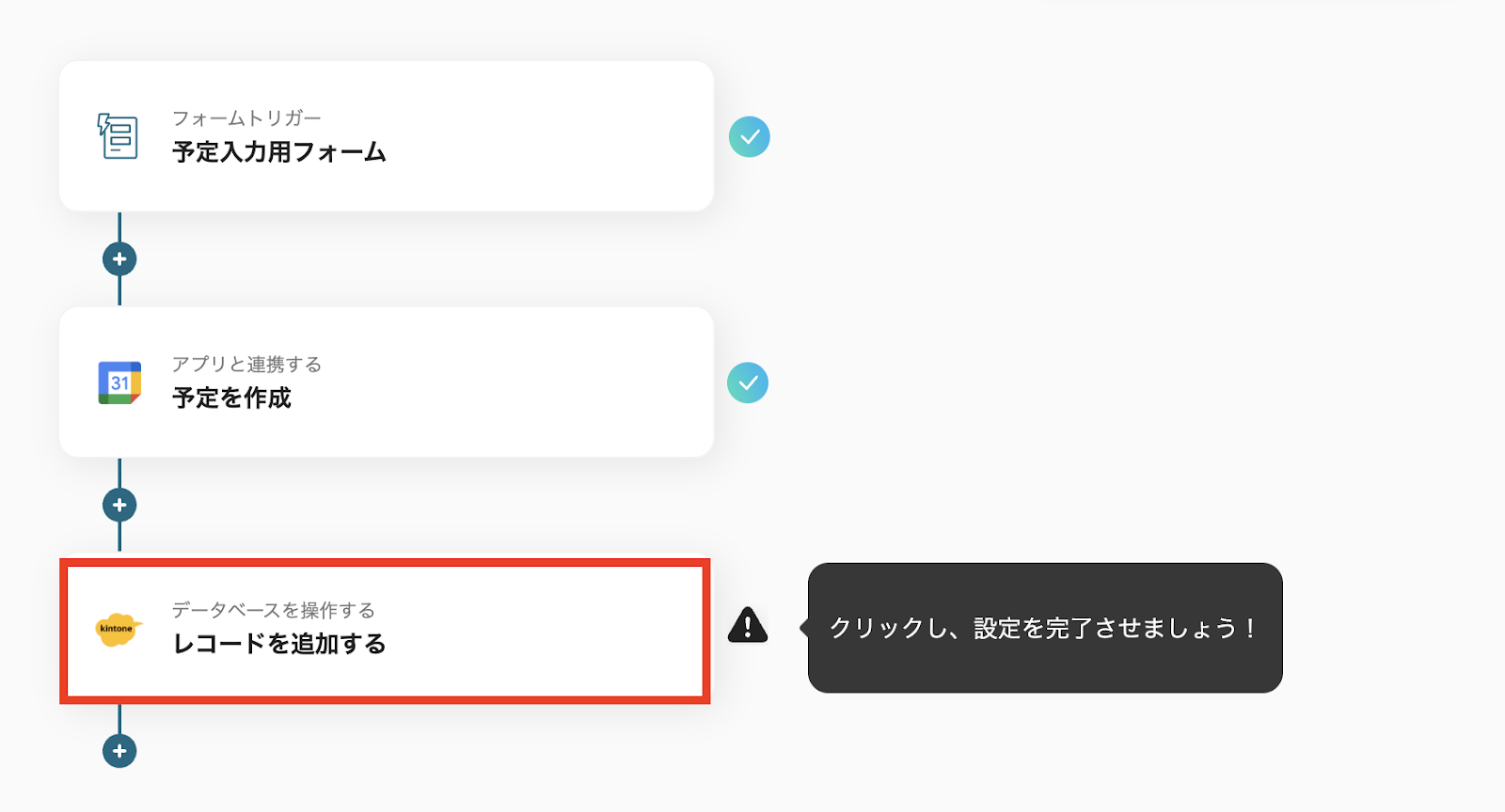 その後フォームトリガーの設定と、Googleカレンダーとの連携が完了したら「レコードを追加する」をクリックします。