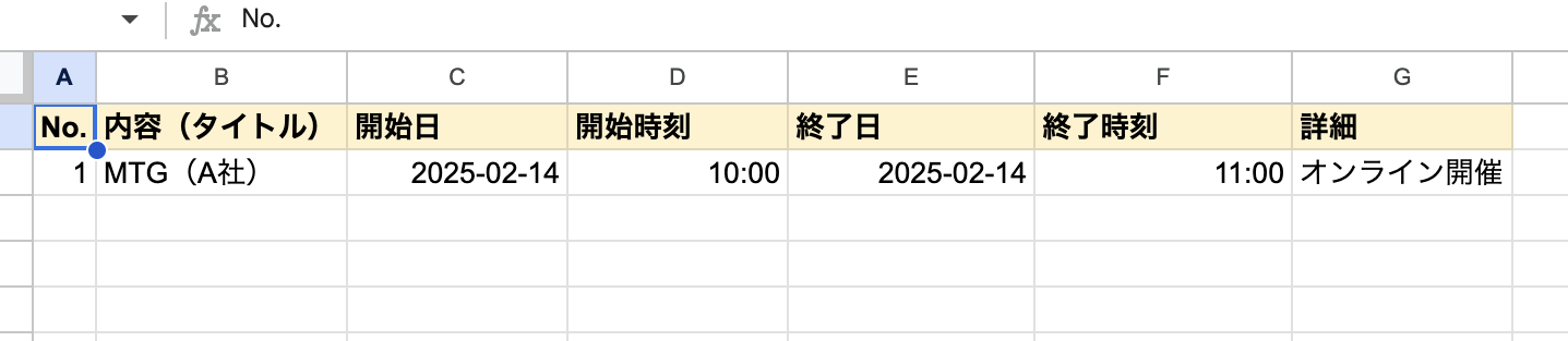 ちなみに今回は、テスト版としてGoogle スプレッドシートにこのような予定表を作成し、行を追加ています。