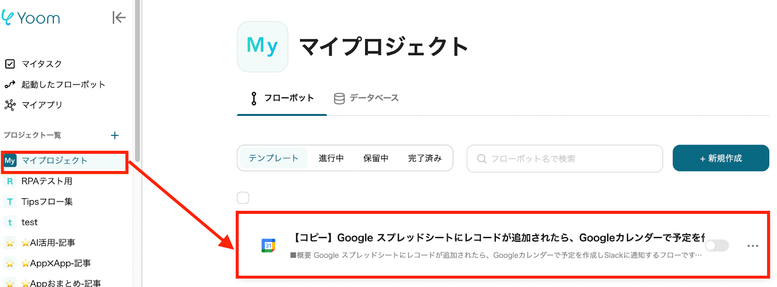 左側にあるメニューの「マイプロジェクト」から、コピーしたテンプレートを開きます。