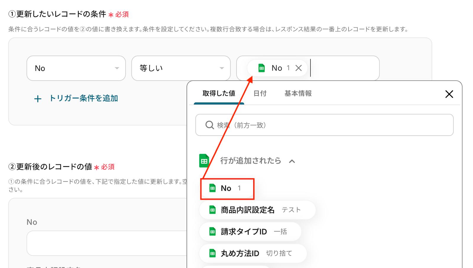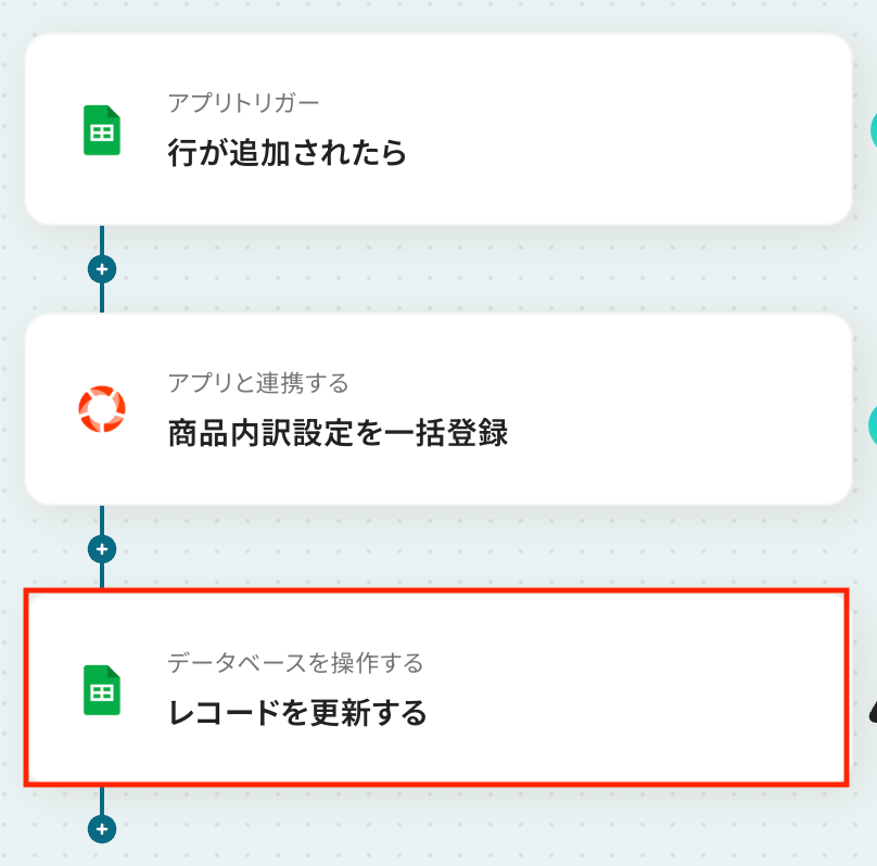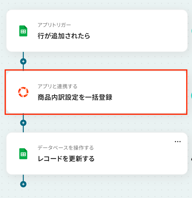 なお、この更新アクションを利用するには、トリガーで更新対象となる商品内訳設定IDを取得できていることが前提となります。