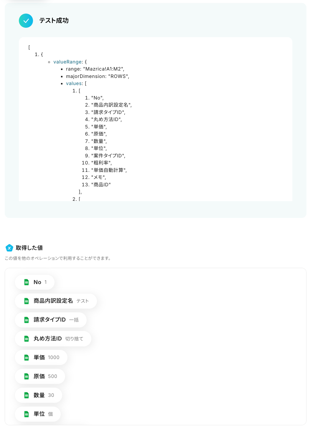 続いて、前のステップでGoogle スプレッドシートから取得した値を利用して、Mazricaで商品内訳設定の登録を行いましょう。