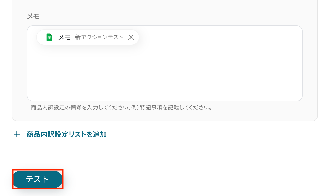 入力が完了したら「テスト」をクリックして、設定した内容でMazricaに商品内訳設定が行われるか確認しましょう。