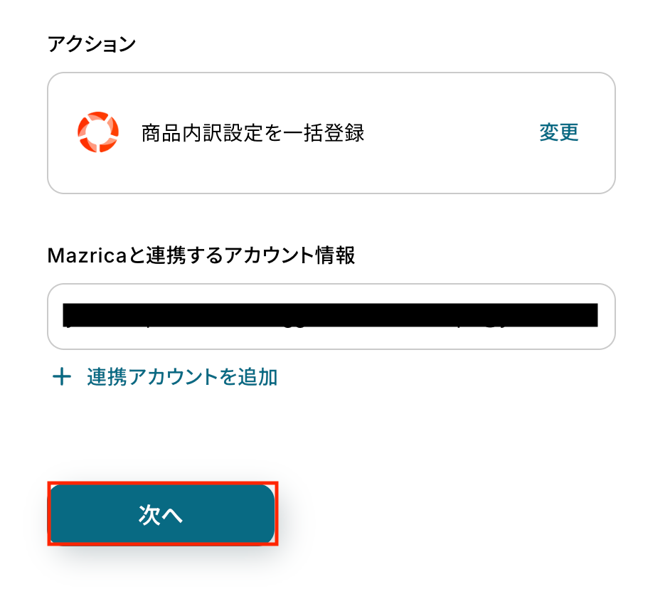 Mazricaと連携するアカウント情報に問題がなければ、「次へ」をクリックします。