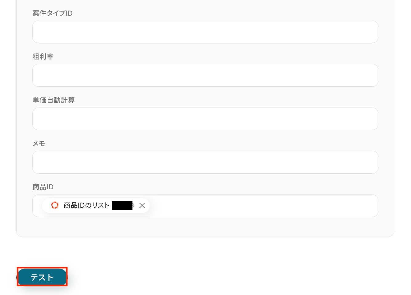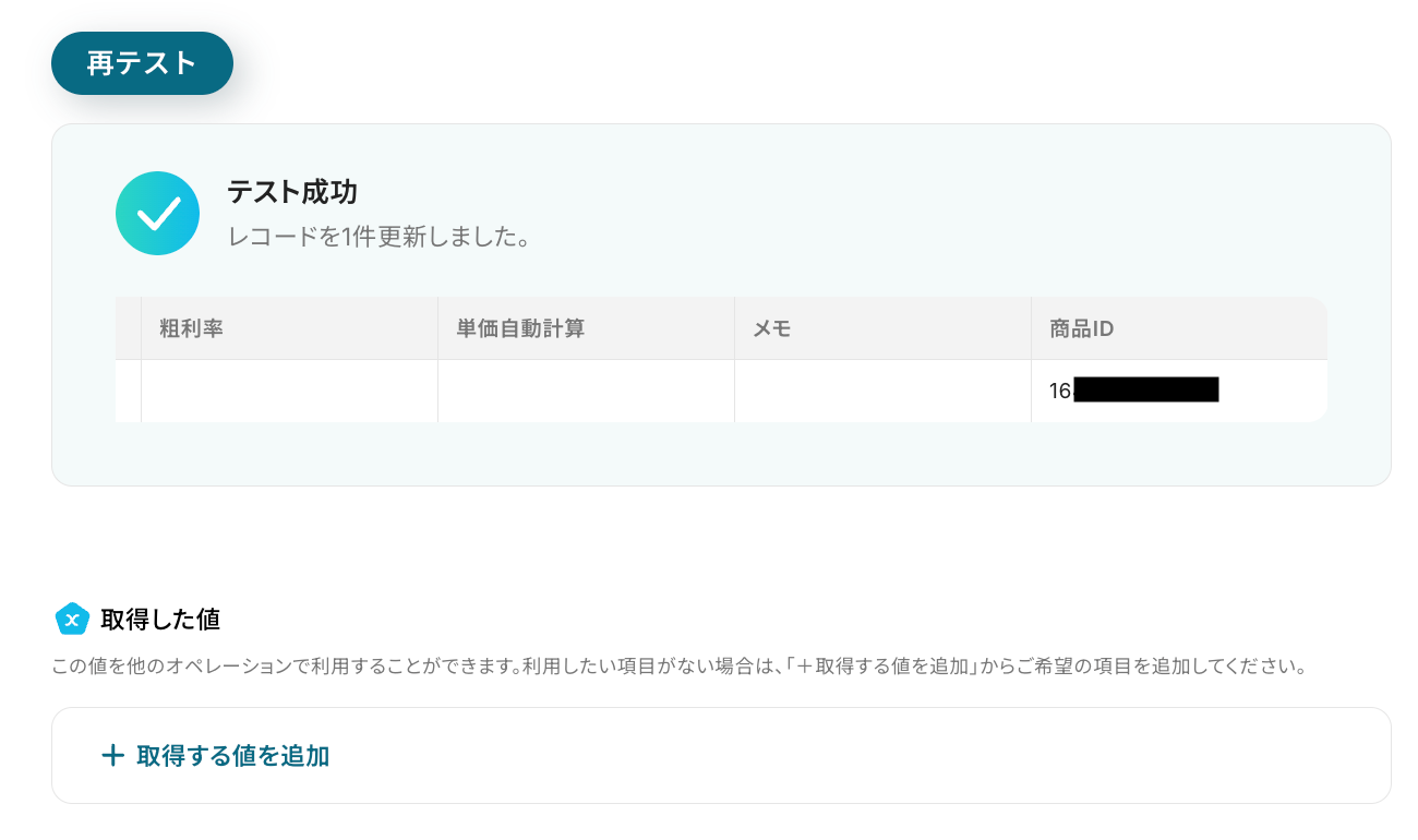 それぞれの項目について入力が完了したら、「テスト」をクリックして、設定した内容でレコードが更新されるか確認しましょう。