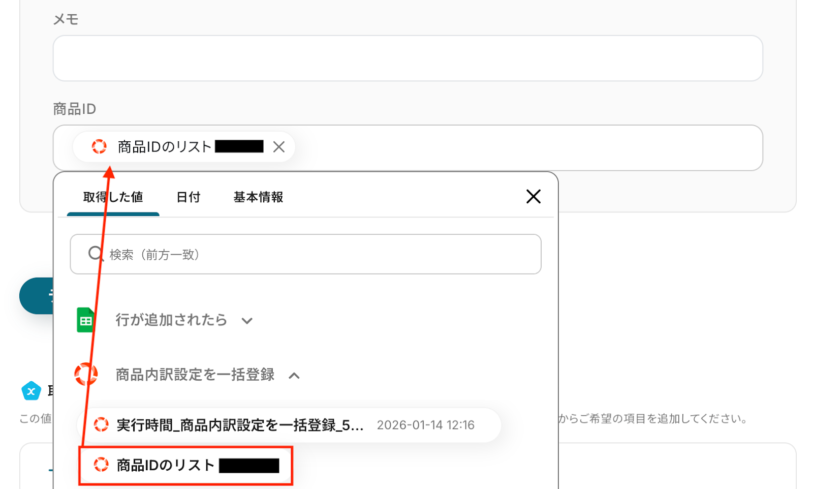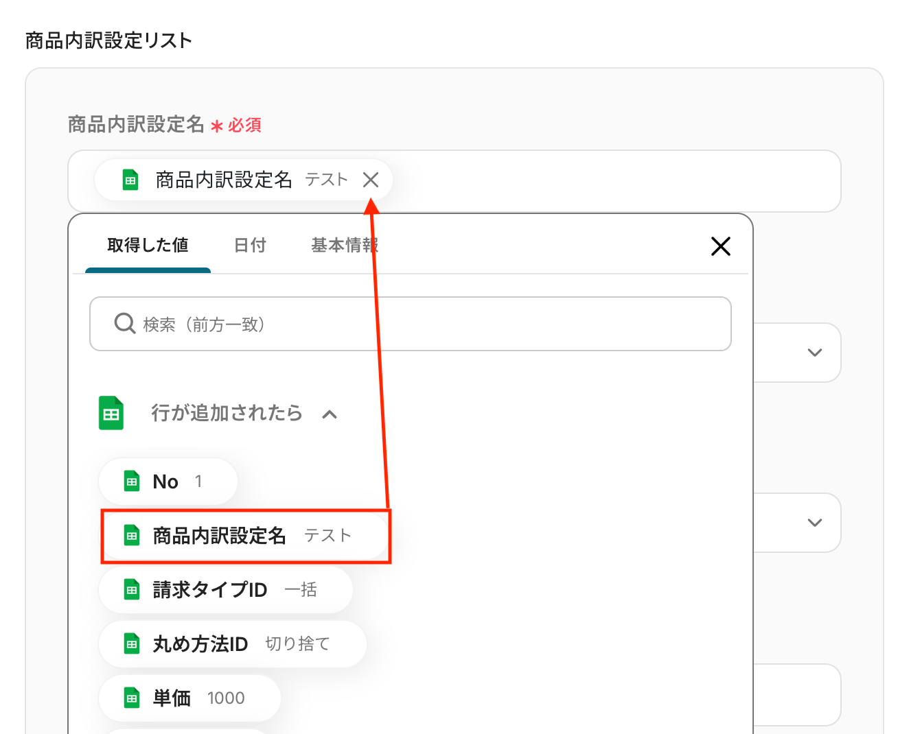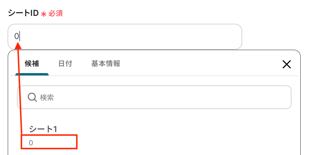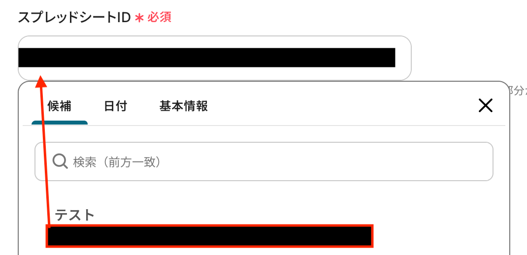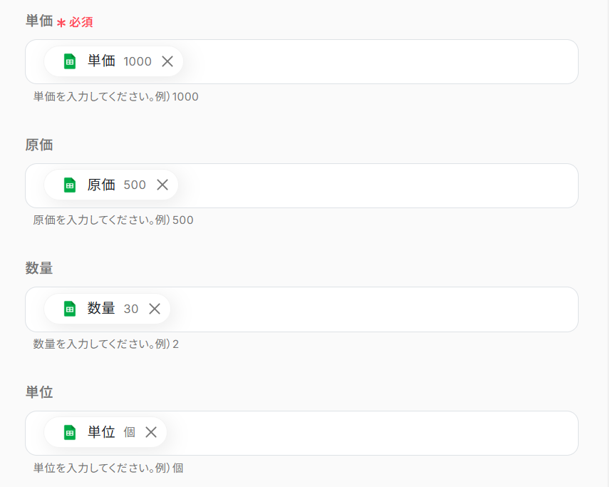 入力欄をクリックすると、前のステップでGoogle スプレッドシートから取得した値が表示されるので、選択して入力しましょう。