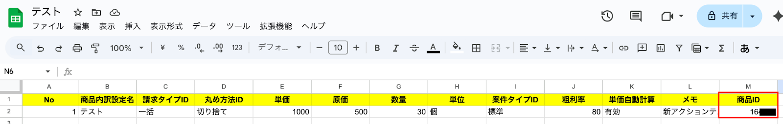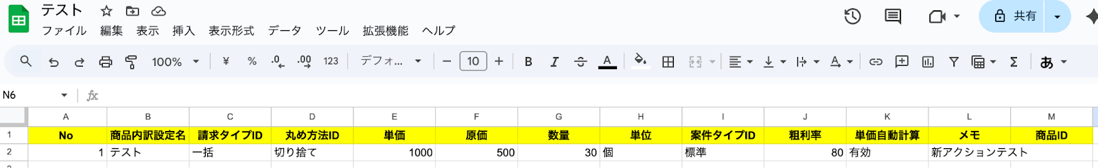 今回はGoogle スプレッドシートで商品情報を管理している想定で、テスト用に以下の行を追加しました。