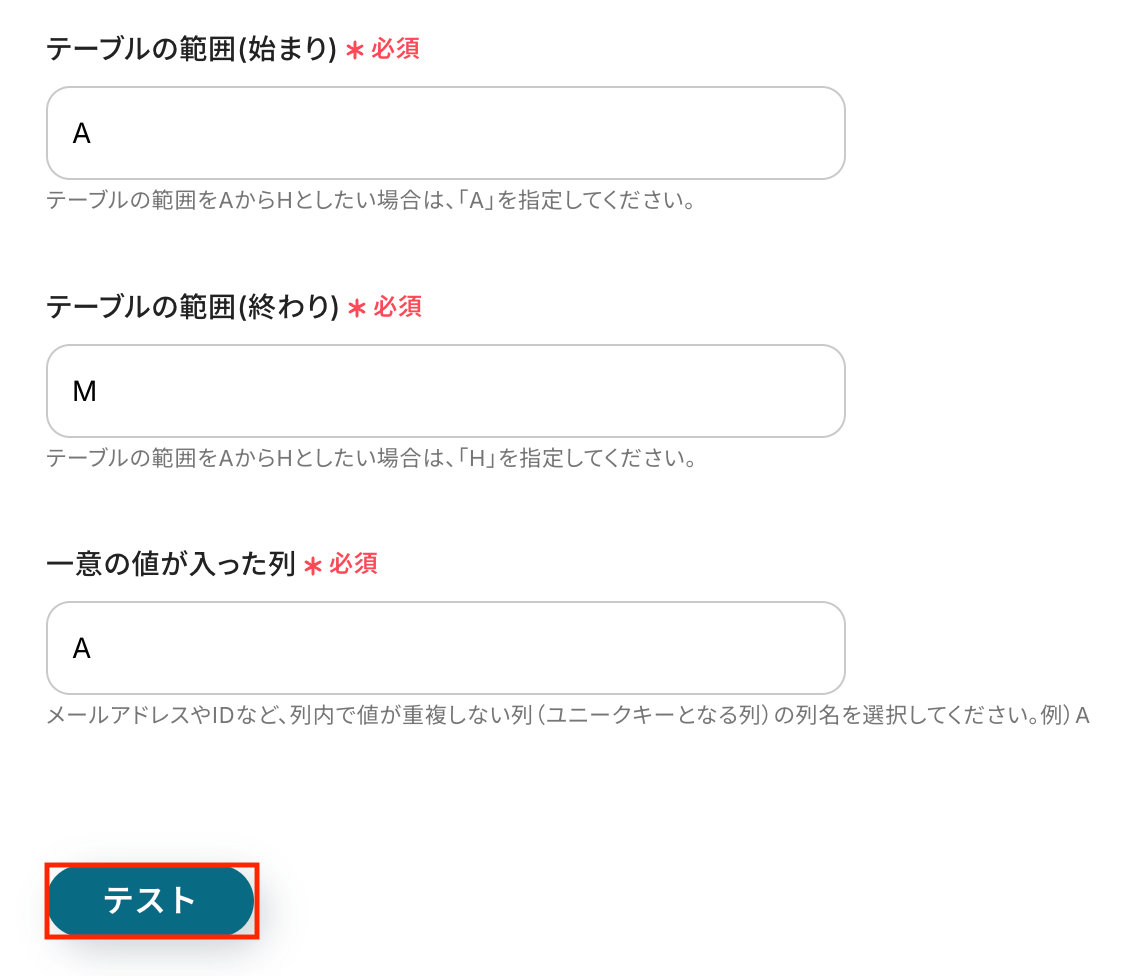 たとえば、AからM列のデータを取得したい時は「A」を指定します。