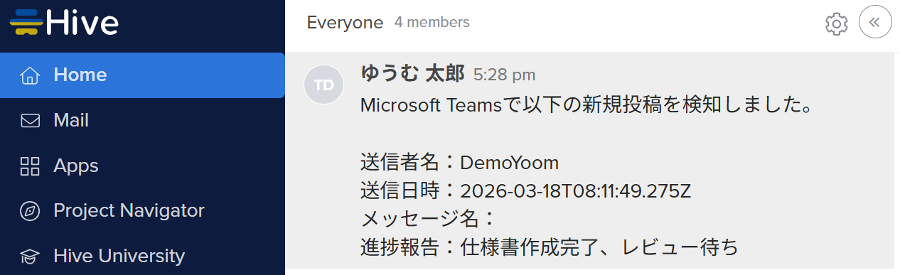 もしMicrosoft Teamsでの投稿内容をメッセージとしてHiveに自動転記できる仕組み があればこれらの悩みから解放されますね。 これにより情報共有の漏れや遅延を防ぎ、より生産的なプロジェクト管理を実現できるでしょう。