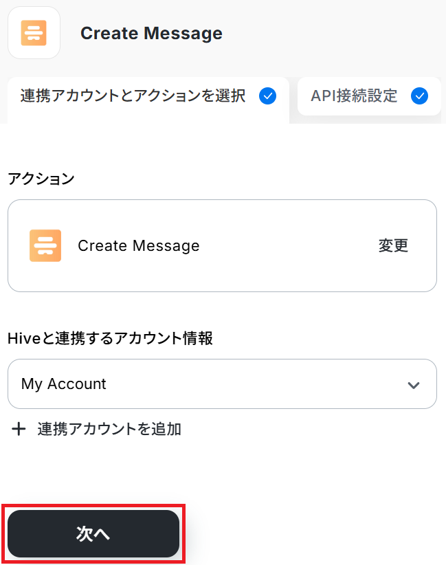 ステップ4:Hiveのアクション設定 先ほど取得した投稿内容を、メッセージとしてHiveに転記します。 「Create Message」をクリックしてください。