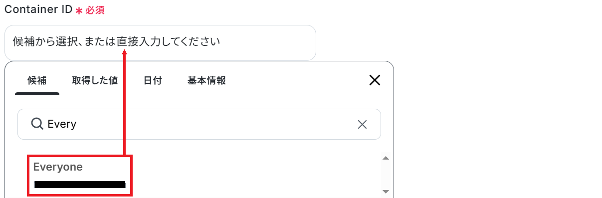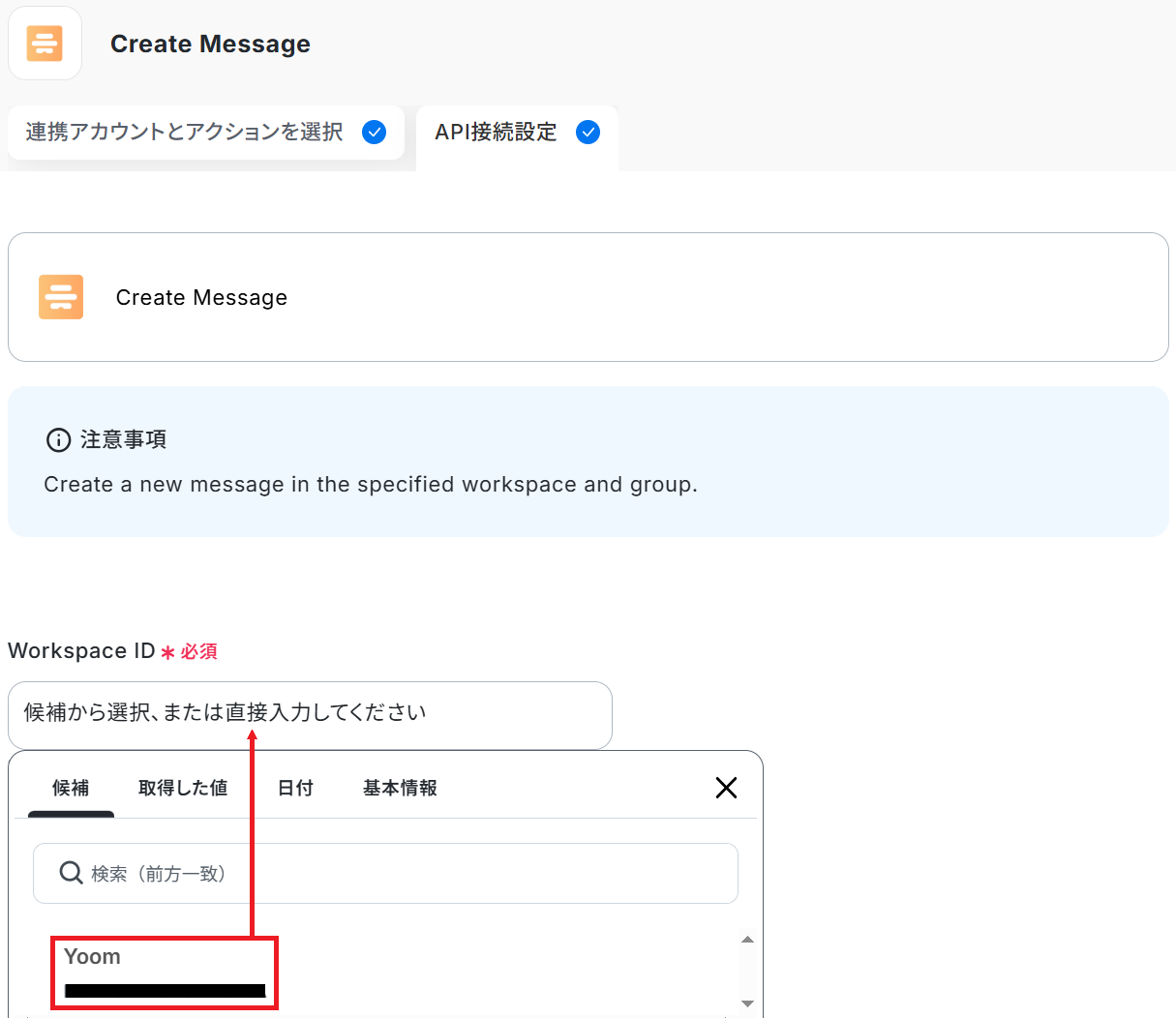 まず、メッセージを作成するWorkspaceのWorkspace ID・Container ID を候補から選択しましょう。