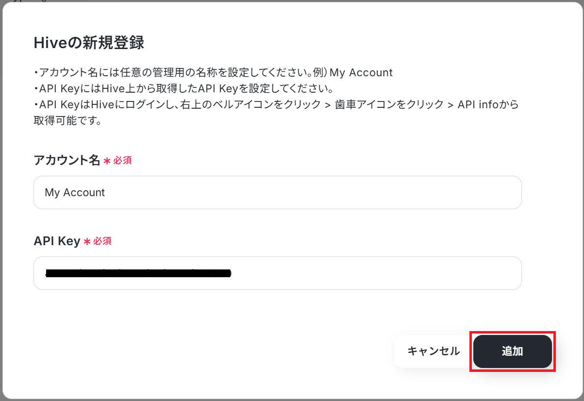 最後に任意のアカウント名 と、先ほど発行したAPI Key を入力し「追加」をクリックするとマイアプリ連携完了です。