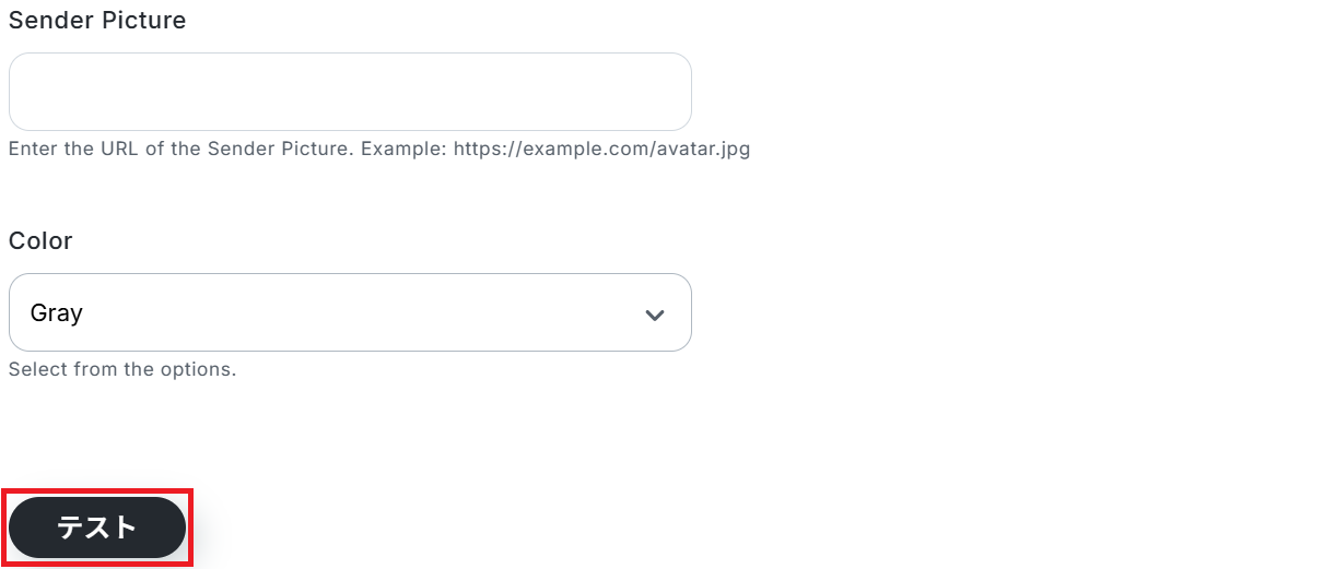 最後に任意でSender Picture (送信者のアイコン)のURLと、Color (メッセージの背景色)を設定しテストしましょう。 未設定の場合アイコンはデフォルト、背景色は白になります。