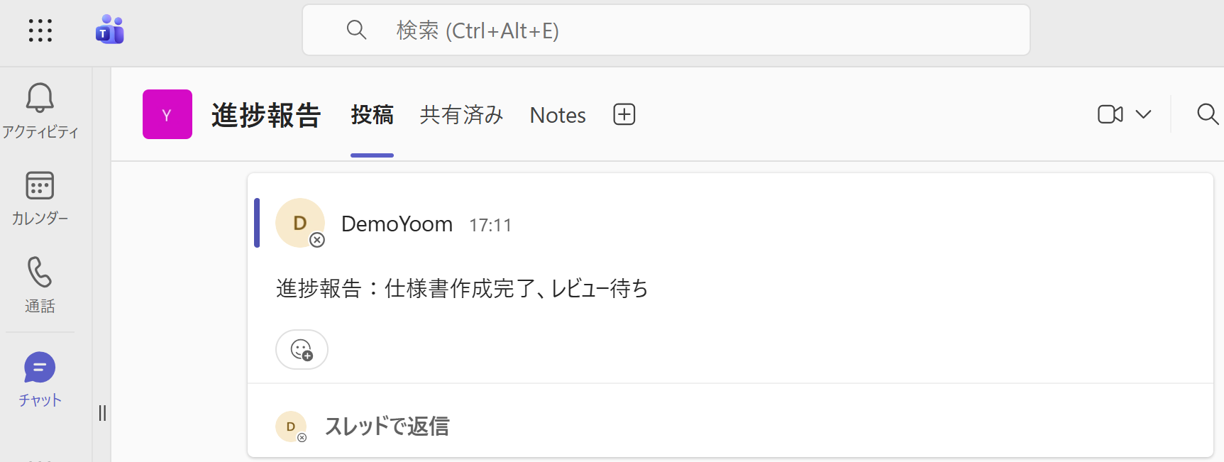 ここまできたら一旦Microsoft Teamsに移り、選択したチャネルにテスト用の投稿をしましょう。