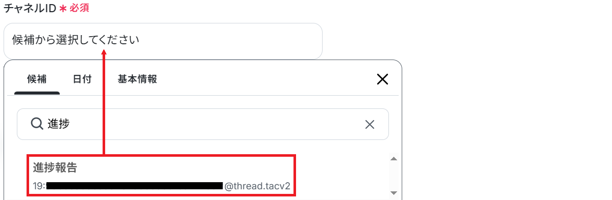 チームIDを選択すると、その下のチャネルID の候補が表示されるようになります。 投稿するチャネルを選択してください。