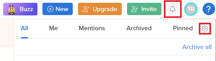 HiveとYoomのマイアプリ登録 まずHiveにログインし、画面右上のベル アイコン→歯車 アイコンをクリックしてください。