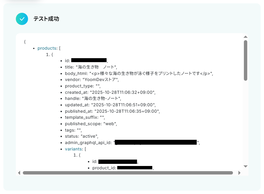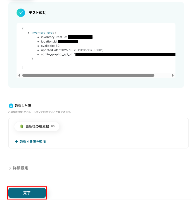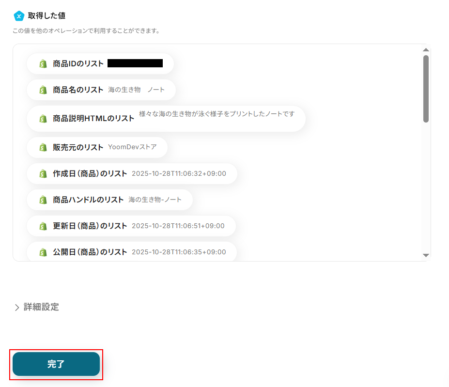 テストに成功するとテスト成功画面が表示され、取得した値が表示されます。 取得した値はこのあとの設定でも使用します。 確認できたら忘れずに完了 をクリックしましょう。