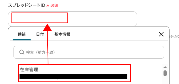 スプレッドシートIDを設定します。 入力欄をクリックし、表示された候補の中から事前準備で作成したものを選択してください。