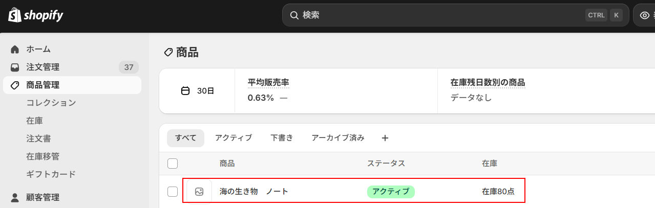 また、実際にShopifyに登録している商品の在庫数が更新されていますので確認してください。