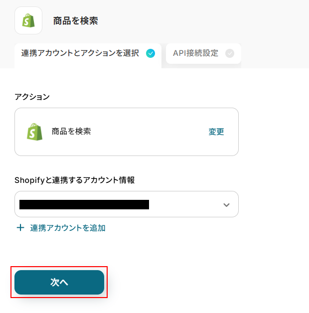 連携するアカウント情報にはステップ1で連携したアカウントか、連携時に使用していたYoomのアカウントが表示されます。 ステップ4と同じアカウントになっていることを確認したら次へ をクリックしてください。