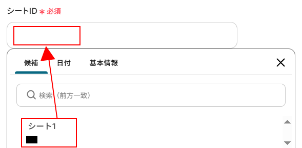 シートIDを設定します。 スプレッドシートIDと同様に、入力欄をクリックし表示された候補の中から使用しているものを選択してください。