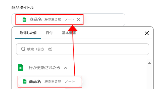 商品タイトルを設定します。 デフォルトで取得した値の商品名が設定されています。 取得した値を活用することで、固定値ではなくトリガーが実行されるたびに最新の情報が反映できます。