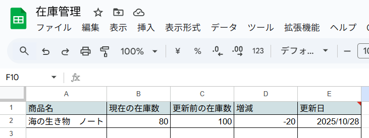 ※以下と同様の表を作成する場合、商品名は一意の値として利用します。 同名の商品名を設定しないようにご注意ください。 また、増減には減っている場合のみ数値の前に- (マイナス)をつけるようにしてください。