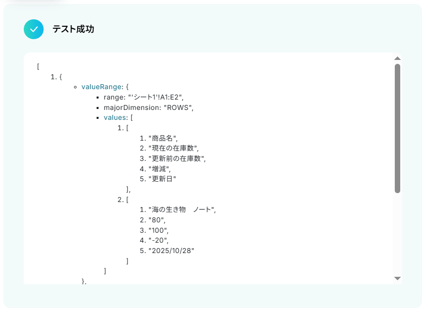 テストに成功するとテスト成功画面と取得した値が表示されますのでご確認ください。 確認できたら完了 をクリックしましょう。