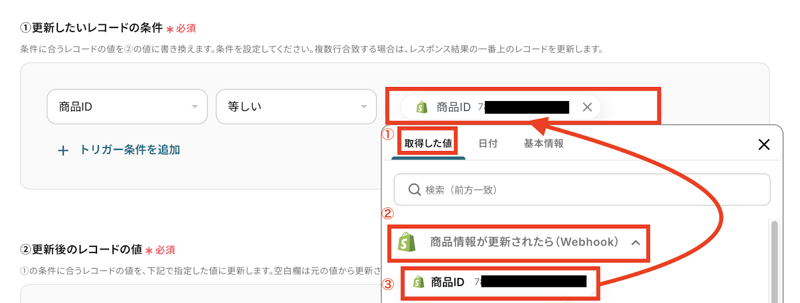 「更新したいレコードの条件」について取得した値を活用して入力します。