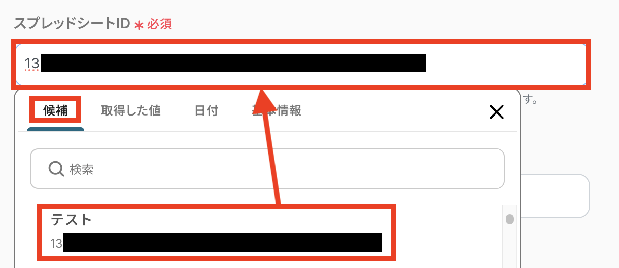 「スプレッドシートID」と「スプレッドシートのタブ名」は候補から選択することができます。