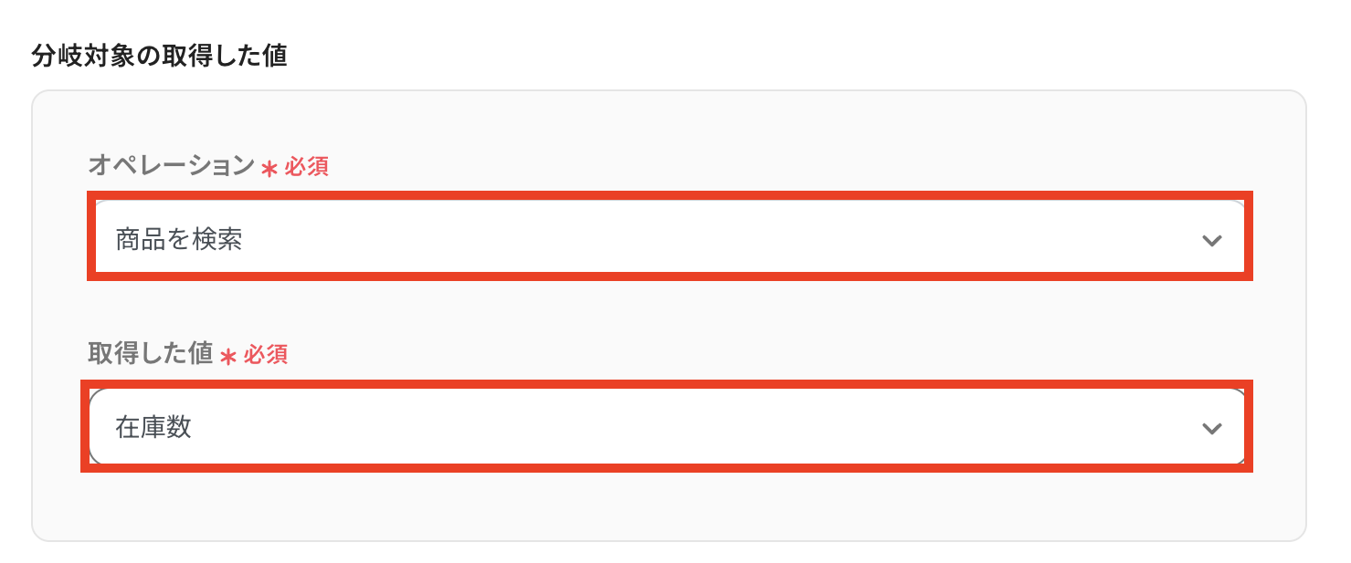 まずは「分岐対象の取得した値」を画像の通り設定します。
