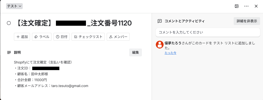 - Shopifyでの支払い完了時に自動でTrelloにカードが作成されるため、これまで手作業に費やしていた転記時間を短縮できます。