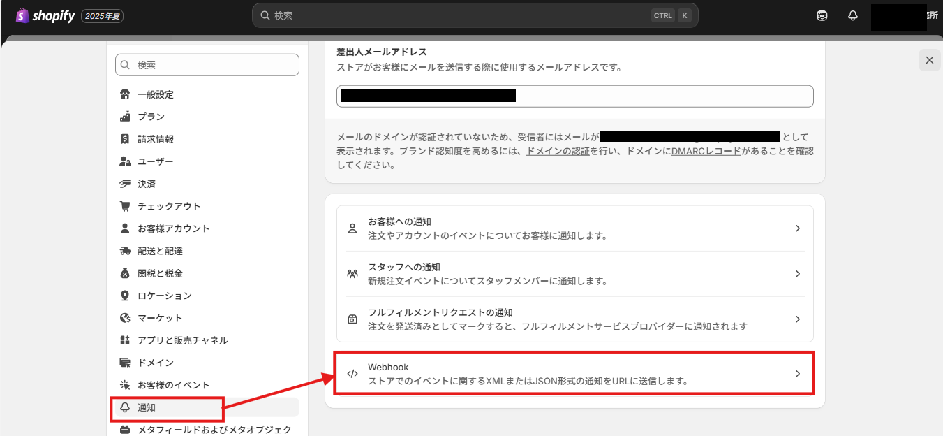 WebhookURLをコピーしたらShopifyの管理画面を開いてください。