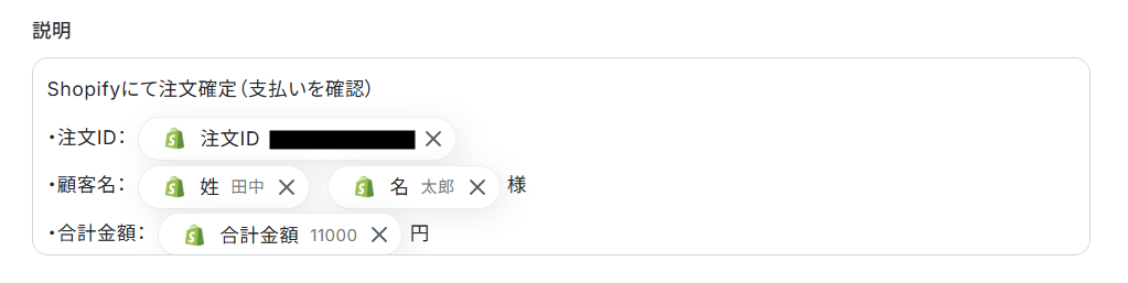 - Trelloカードのタイトルや説明文に含めるShopifyの情報は、注文番号、顧客名、商品名、金額など、必要なデータを自由にカスタマイズして設定できます。