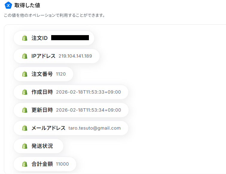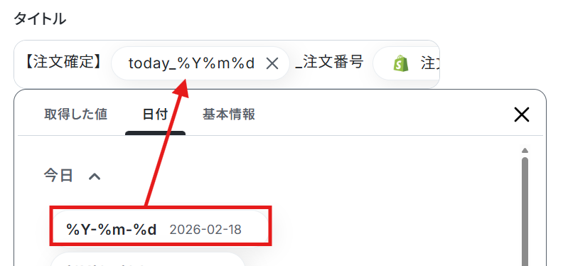 デフォルトでは「今日の日付」と取得した値から「注文情報」が自動で反映されるように設定されています。