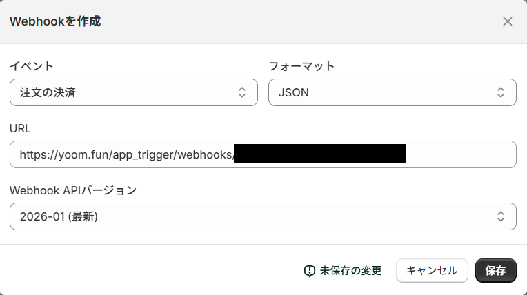 イベントは「注文の決済」を選択し、URL欄には先ほどYoomの画面でコピーしたWebhook URLを貼り付けてください。
