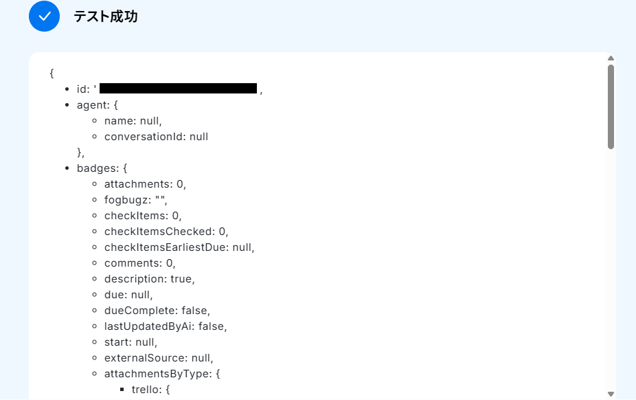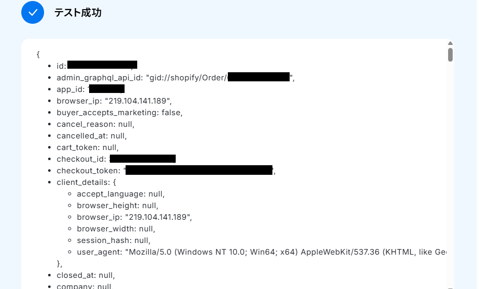テストが成功すると、取得した値が表示されるので確認しましょう。