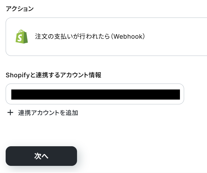 - 次に、トリガーでShopifyを選択し、「注文の支払いが行われたら(Webhook)」というアクションを設定します。