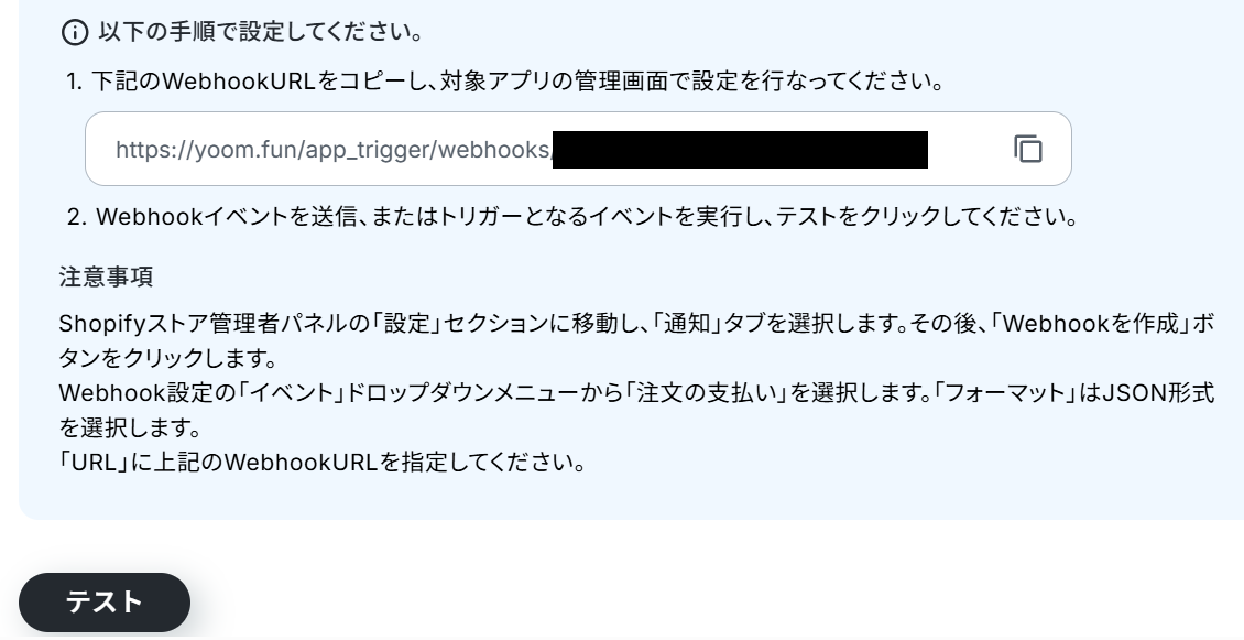 下記画面の注意事項を確認しながらWebhookの設定を行います。