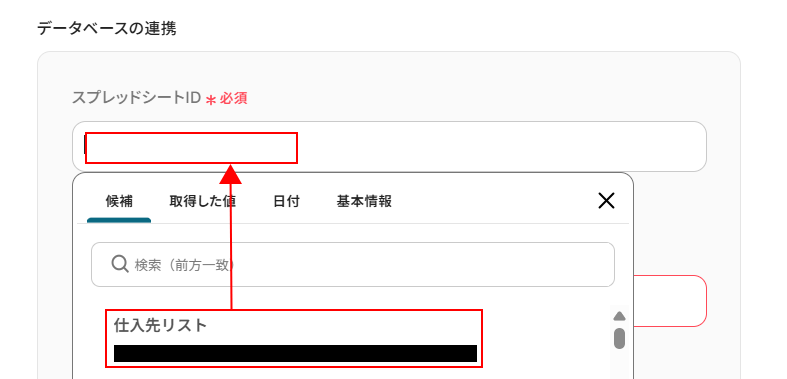 スプレッドシートIDを設定します。 入力欄をクリックし、表示された候補の中から使用したいものを選択してください。