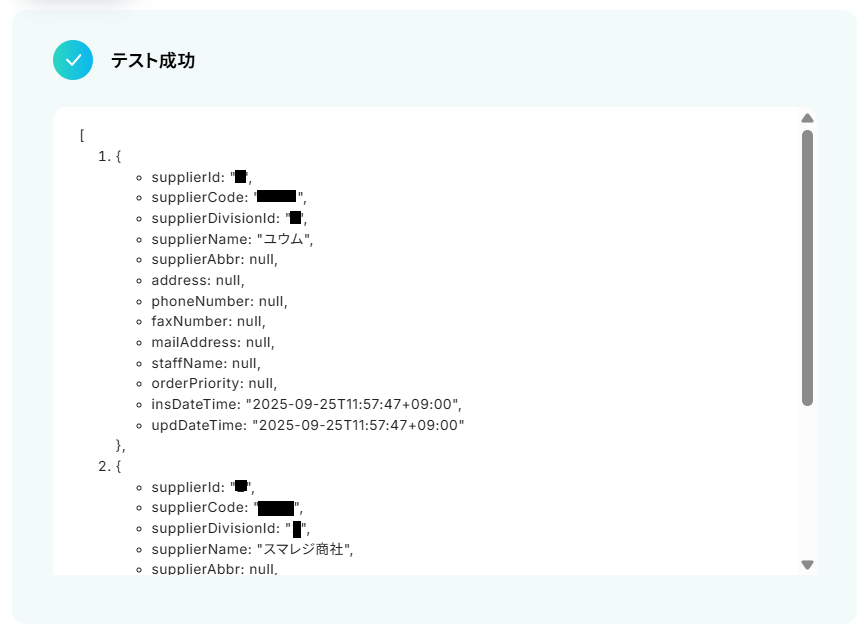 テストに成功するとテスト成功画面が表示され、取得した値が表示されます。 取得した値は実行した結果が設定される動的な値として利用できるため、このあとの設定でも使用します。 詳しく知りたい方は以下のリンク先をご覧ください。