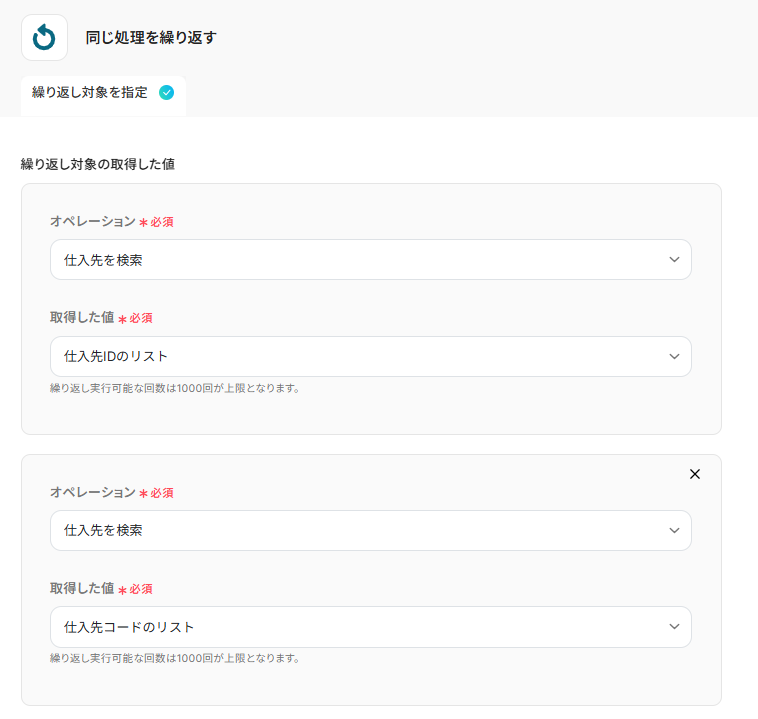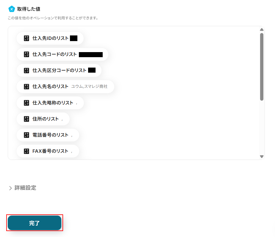同じ処理を繰り返すアクションでは、先ほど複数取得したデータをそれぞれ個別に使用できるように処理を行います。 今回はデフォルトで仕入先を検索 アクションで取得した、仕入先IDのリスト、仕入先コードのリスト、仕入先名のリスト、電話番号のリスト、更新日時のリスト が設定されていますのでご確認ください。 この項目で設定した値は、次のステップでGoogle スプレッドシートに登録する情報として利用します。 新しく値を追加したい場合は、+取得した値を追加をクリックし、設定を行ってください。 使用したい値が全て設定できているのを確認したら完了 をクリックしましょう。