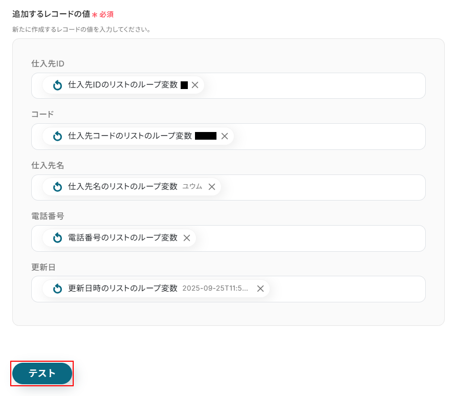 全て設定できているのを確認したらテスト をクリックしましょう。 ※テストをクリックすると、実際にレコードが追加されます。