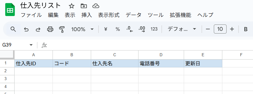 事前準備 Google スプレッドシートを用意する 今回ご紹介するテンプレートは、スマレジに登録した仕入先情報を自動でGoogle スプレッドシートに転記します。 まずは、仕入先情報を転記するためのGoogle スプレッドシートを用意しましょう。 今回は以下のシートを用意しました。